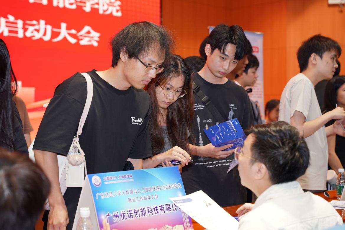 10月14日下午,广东财经大学大数据与人工智能学院在广州校区正心堂举行2026届毕业生就业工作启动大会。学院领导班子、全体教职工(有授课任务者除外)、2026届毕业研究生、本科生参加。中国联塑集团、广东鸿数科技有限公司、广州优诺创新科技有限公司、深圳市亚飞电子商务有限公司、广东亿迅科技有限公司、广东盈浩工艺制品有限公司、广州有鱼科技信息有限公司、炬财(广州)软件科技有限公司、载富(广州)外贸综合服务有限公司、佛山易瑞康科技有限公司、无忧传媒等11家企业代表和校友代表受邀参会。大会由学院党委副书记龙启艳主持。