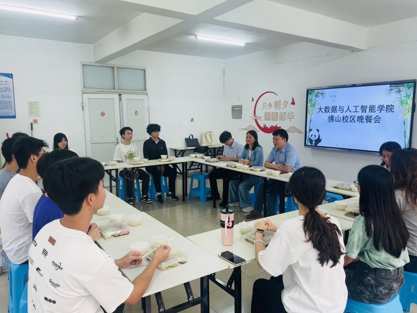 2026年4月15日晚,大数据与人工智能学院在佛山校区竹园一站式学生社区19栋113活动室举办以“师生同心筑梦想,晚餐温情伴成长”为主题的书记晚餐会。学院党委书记廖凌杰、党委副书记龙启艳、24级、25级辅导员老师,与来自各班级、团学组织的14名学生代表共进晚餐、倾心交谈。