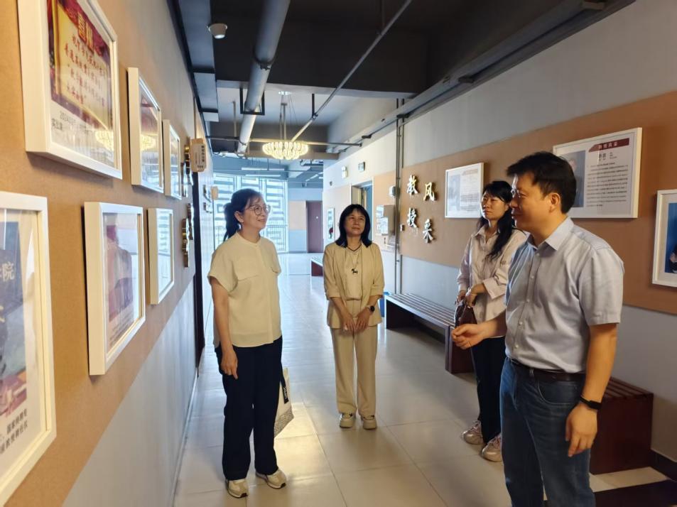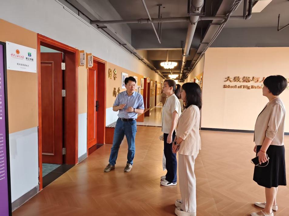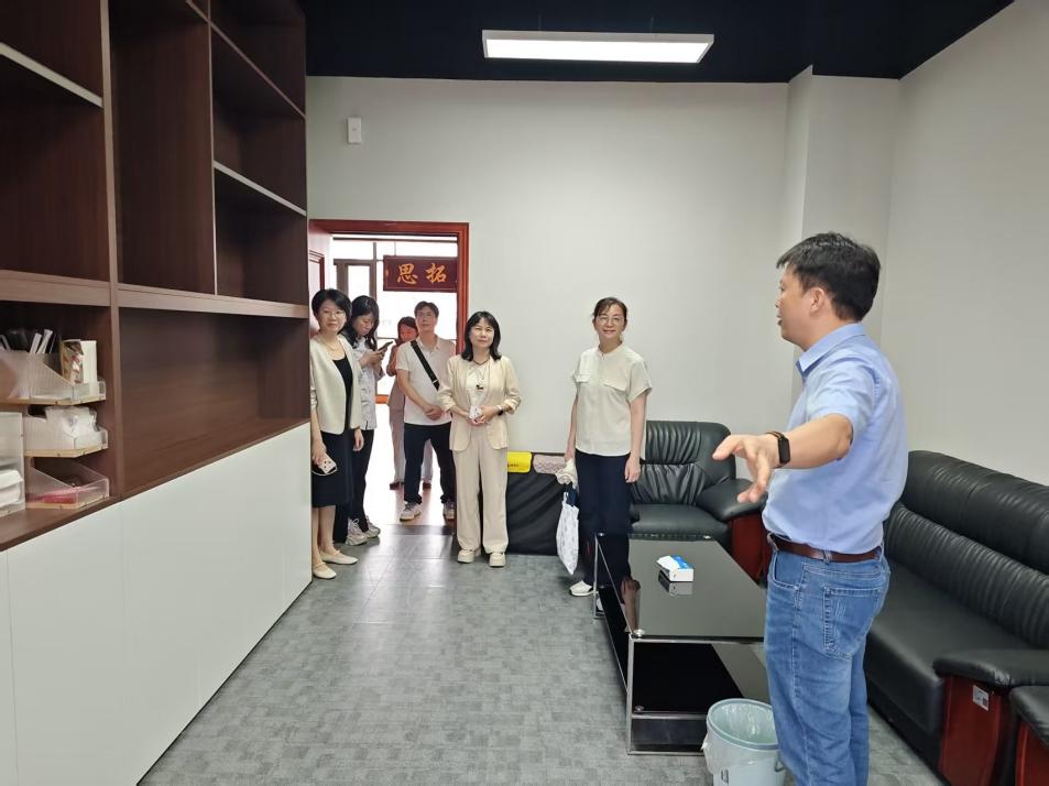 廖绮晶一行首先实地参观学院文化长廊、职工之家、全国总工会职工书屋便民阅读点、思拓厅及可开展沙龙活动场地等特色功能区域,细致察看各处空间规划、环境布置、硬件配套与整体建设布局。参访过程中,一行人详细了解各点位建设规划、管理与综合服务功能,重点询问专属沙龙场地的承载条件、功能适配与使用规划,全面掌握学院在文化氛围营造、职工暖心服务、师生阅读推广、学术研讨交流、主题沙龙举办、团建联谊组织等方面的阵地建设基础。