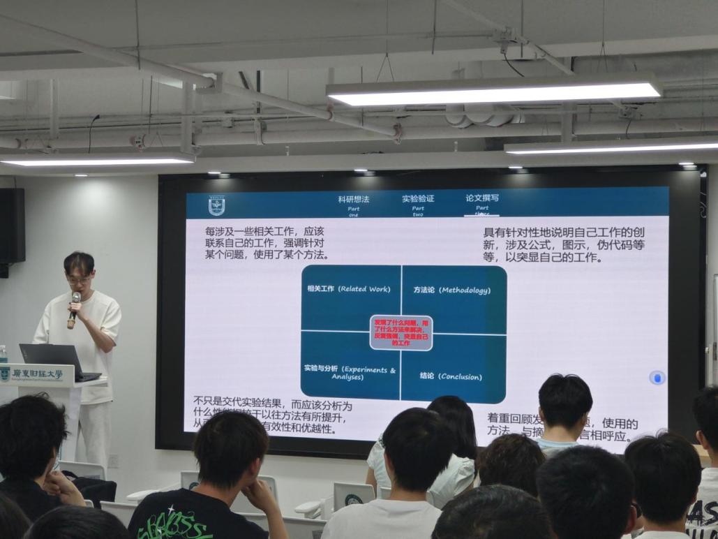 23级计算机技术研究生周业杰(暨南大学拟录取博士研究生),结合自身科研经历,从创新想法生成、实验验证、论文写作三个核心环节分享实用经验。他建议同学们从综述论文切入寻找研究问题,善用开源代码与公开数据集开展实验,强调论文写作要清晰呈现“问题—方法—结论”逻辑,突出原创贡献与创新点,为低年级同学开展科研工作提供清晰指引。最后,师兄也以自身经历勉励大家:“科研虽艰难,但终会成功!回看过往,均是传奇!”