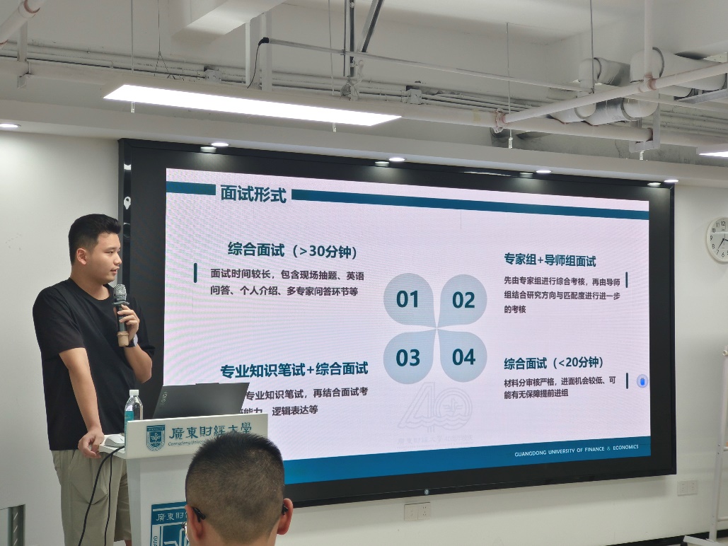 活动特邀两位成功上岸的优秀研究生主讲。23级计算机技术研究生古韬(中山大学拟录取博士研究生),围绕申博全流程展开系统分享,详细讲解申博信息查询渠道、学硕型博士与专硕型博士的区别、关键时间线规划、申请材料准备及面试形式等内容。他提醒同学们提前梳理科研成果、理性选择院校与导师,警惕付费申博骗局,以真实实力应对考核,同时也勉励大家:“合作不等于模糊自己的贡献,参与也不等于真正形成了自己的积累,在求学路上要始终坚守本心、扎实沉淀,稳步走好每一步。”