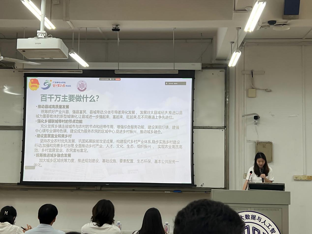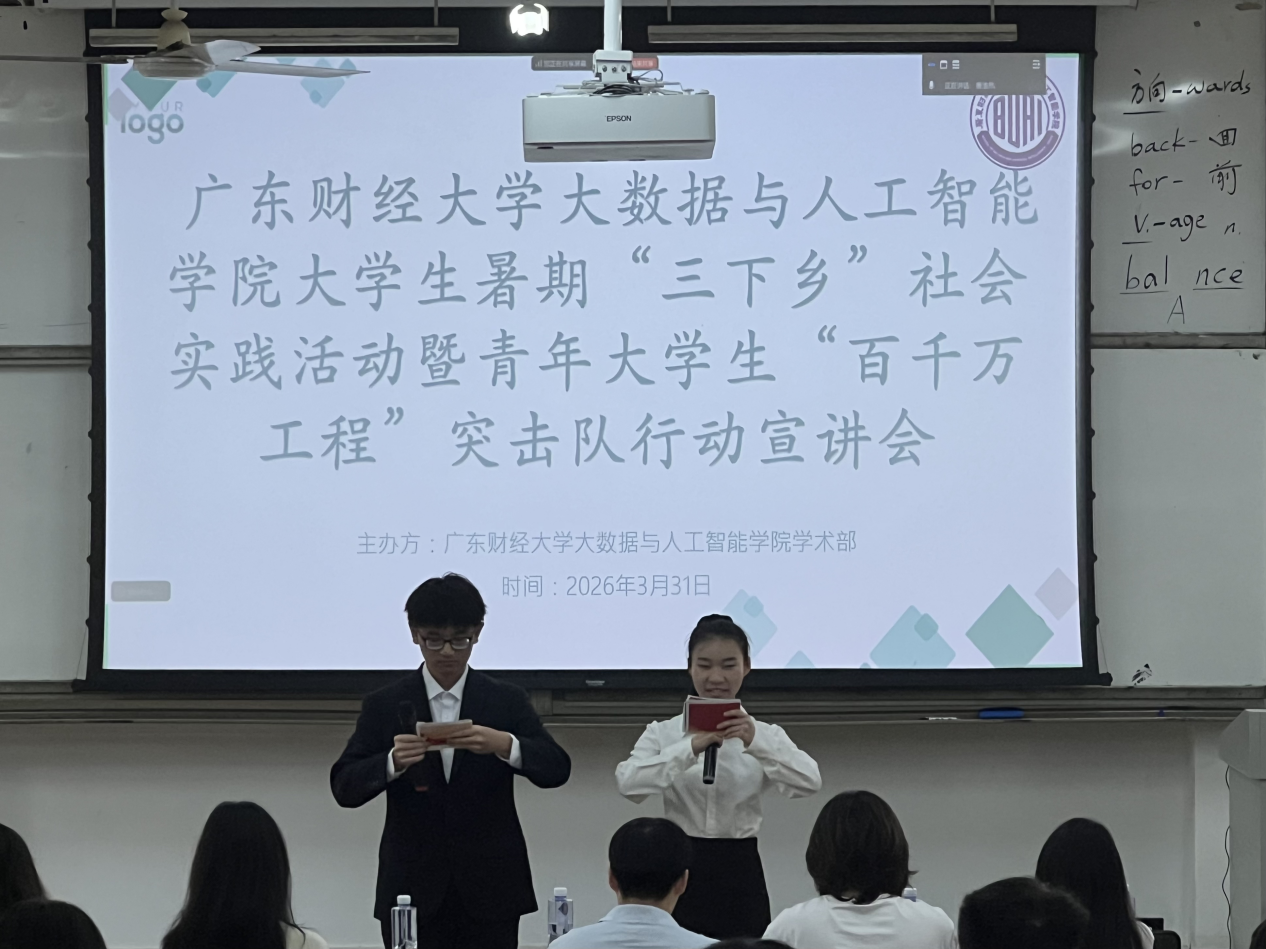 为深入贯彻落实“百县千镇万村高质量发展工程”部署要求,引导广大青年学子积极投身“三下乡”社会实践活动,在实践中增长才干、服务社会,2026年3月31日下午,大数据与人工智能学院于励学楼107举办“三下乡”百千万工程宣讲会暨交流会。学院团委书记何镇宇、2025级辅导员代表曾汇萍、学院常委团成员、往届优秀团队负责人、学术部成员及260余名学生参与本次活动。